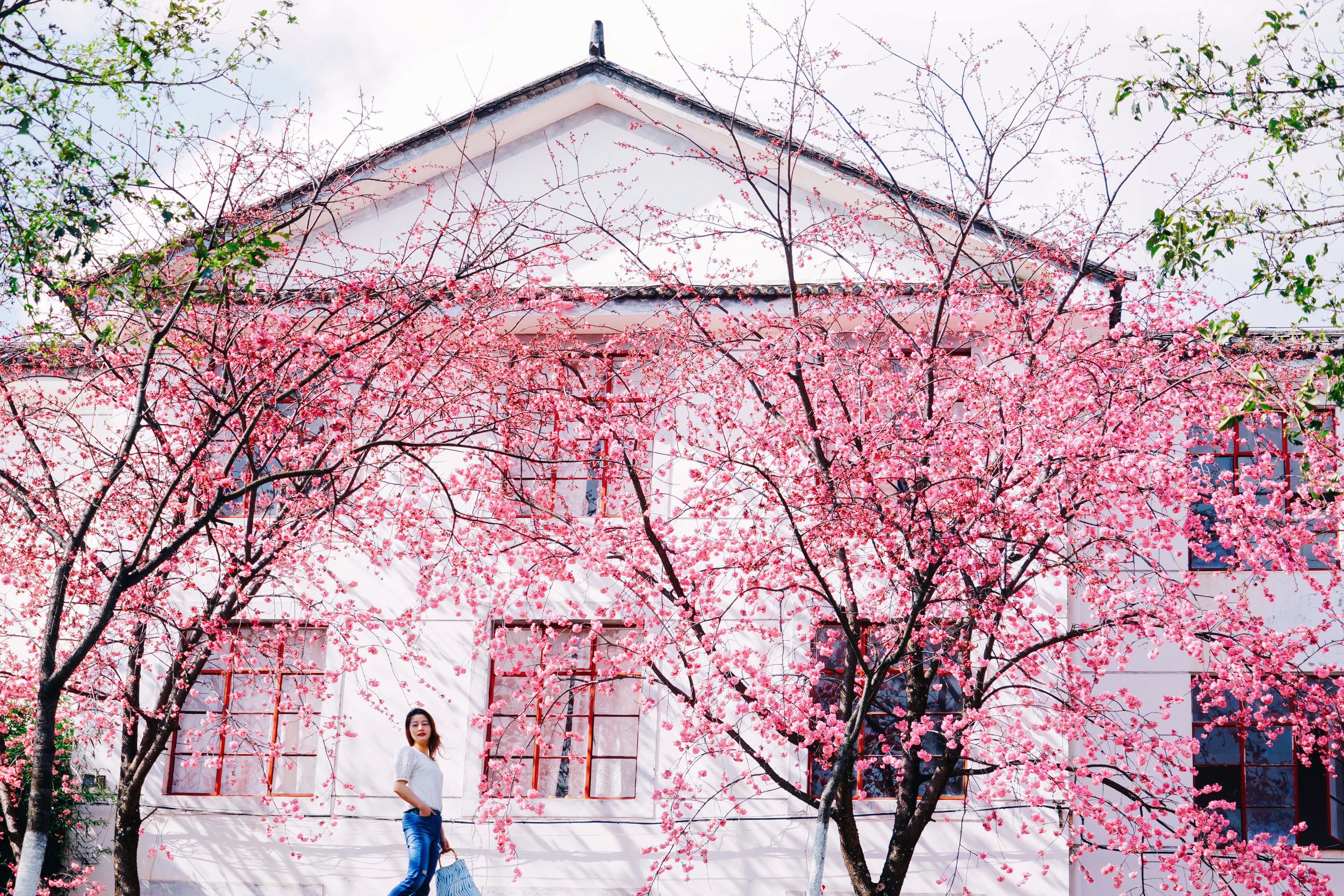 说到在校园赏樱,还有一座大学不得不提,那就是云南的大理大学。与武大的浅粉樱花不同,这里的樱花色彩更加明艳,是深粉红色的。而且大理大学背靠苍山、面朝洱海,可以说是『最文艺的赏樱校园』了。待一阵春风吹过,樱花瓣如飞扬的雪片儿,飘在空中,也落在粉红的少女心上。樱花的花期很短,趁春日正好,出发大理吧!