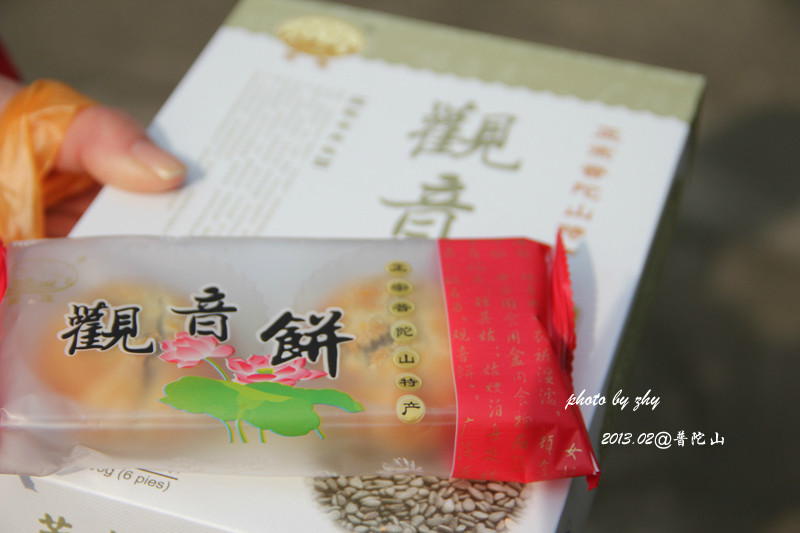 普陀山观音饼采用海苔、黑芝麻、花生等天然原料做馅。皮色为金黄色,具有外酥里糯,自然香味浓郁,不粘牙等特点。岛上随处都有,比如香华街、梅岑路、南天门附近的南天门商业街以及各景点、香道附近摊贩有售卖,可还价。建议晚些时候买,夜来生意,比较好商量。在普陀山买大约12元一盒。