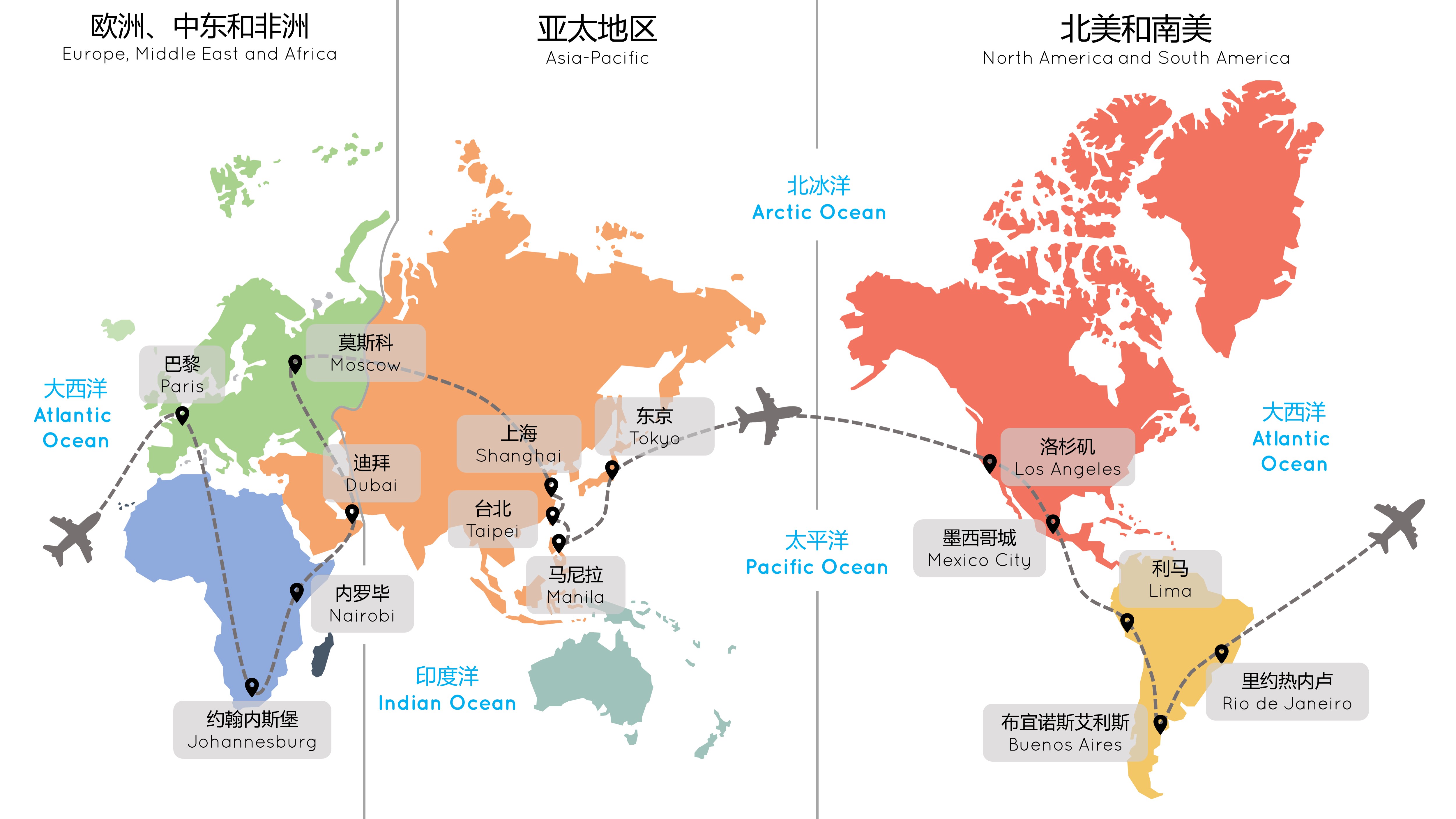 天合联盟把全球划分为三个区域,即1区为北美和南美;2区为欧洲、中东和非洲;3区为亚太地区。凭借环球套票,你可以选择具有 2-15 个中途停站的任何旅程,但必须包含一次飞越大西洋的航班、一次飞越太平洋的航班和一次在2区和3区之间的航班。 环球套票只能按一个方向飞行,你的旅行的起点和终点必须是同一个国家(可以是不同城市)。比如从中国出发,你可以一路向东先去美洲(1区),再去欧洲、中东和非洲(2区),最后回到亚洲(3区),也可以逆向而行。这里按一个方向飞行,指的是大方向,比如你飞到了2区,那么在欧洲和非洲之间怎么飞都行。