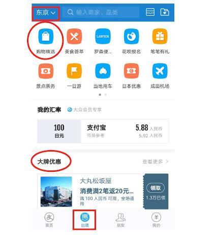 路径:在境外,点击支付宝首页底部的“惠出境”(境内显示为“口碑”),左上角城市会自动跳转至“当前目的地”,如东京,自动跳转至该城市的“惠出境”页面。
