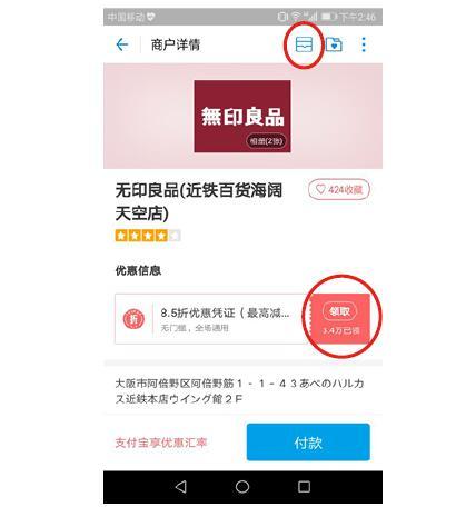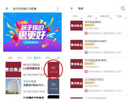 点击“日本优惠”进入优惠集合页或者搜索商户名,如“无印良品“,进入无印良品的详情页,领取无印良品优惠券。