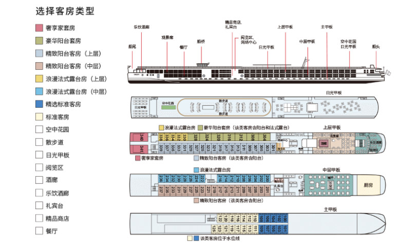 套房将提供更多的空间,让一家人的船上生活更加舒适和豪华。“奢享家套房”拥有私人全景阳台,“豪华阳台套房”拥有景观阳台。所有套房都有开放式起居室、含法式露台的卧室。