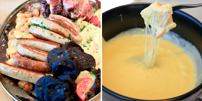 在瑞士、德国、法国等地上岸后,在当地餐厅进餐,包括德国猪脚、香肠、啤酒、瑞士芝士火锅、法式大餐等。