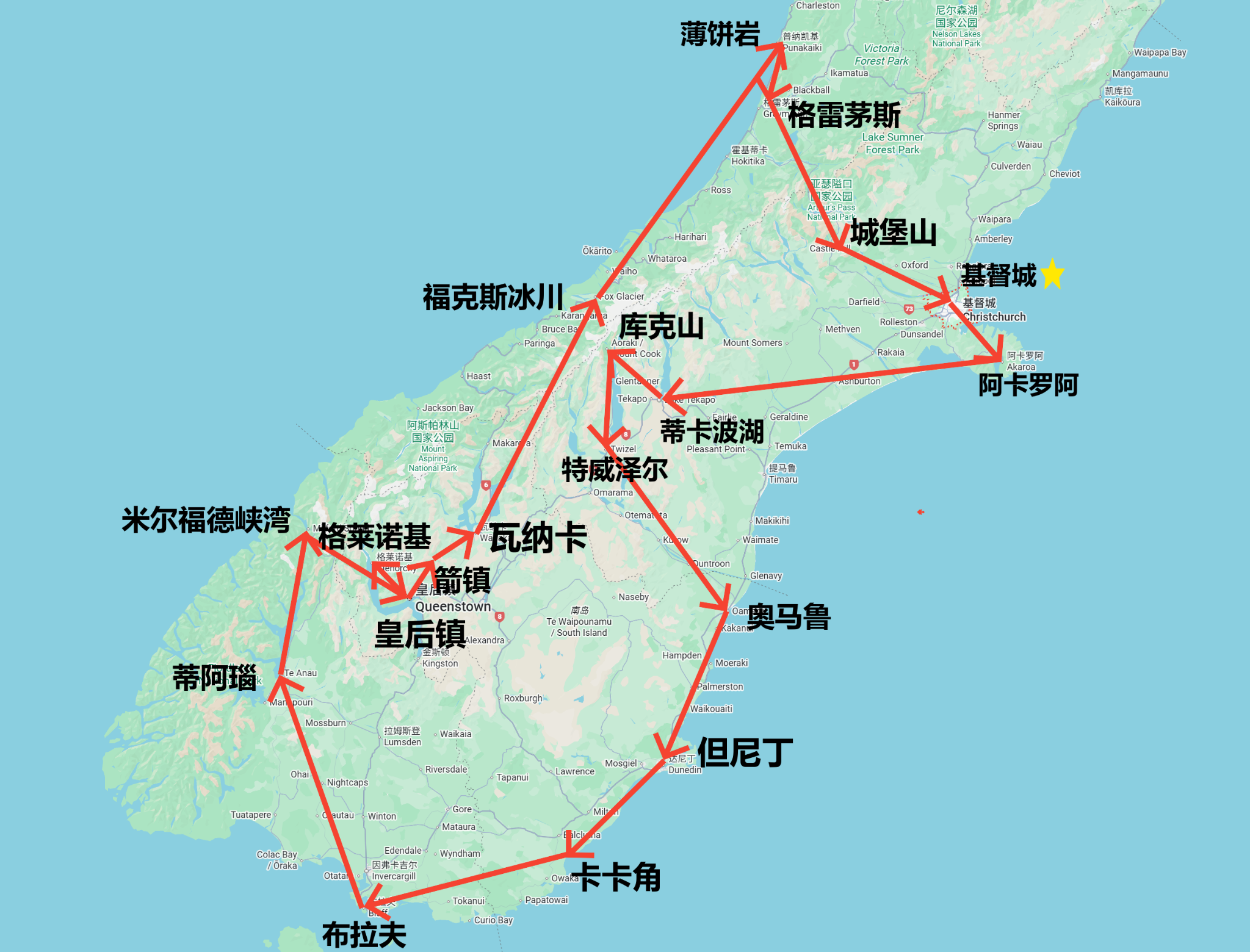 🔸新西兰概況🔸 新西兰 (New Zealand),位于太平洋西南部,它是由 南岛 、北岛、 斯图尔特岛 以及附近的一些小岛屿组成的,属于温带海洋性气候。国土面积约为270000平方千米,海岸线长约15000千米。截至2024年6月, 新西兰 总人口约533.8万,其中, 欧洲 移民后裔占67.8%,毛利人占17.8%,华人占5.6%。 官方语言为英语、毛利语,主要信奉基督教。 🔸路线🔸 此次的行程从 基督城 出发,顺时针绕 南岛 自驾游,历时10天,如下图所示: 但计划赶不上变化,行程中的 阿卡 罗阿,格莱诺基和博饼岩我们并没有去,因为基本上我们都是早上10点才